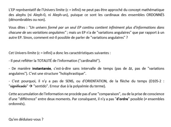 El EP representativo del Universo límite (c = infinito) no puede ser aproximado por el concepto matemático de los alephs (ni Aleph-0, ni Aleph-uno), ya que estos son los cardinales de conjuntos ORDENADOS (contables o no).