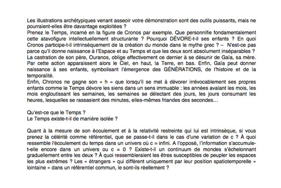 En cuanto a la medición de su flujo y la relatividad especial que le es intrínseca, si se toma la velocidad como marco de referencia, ¿qué ocurre en el caso de una variación de c? ¿Cómo es el flujo del tiempo en un universo donde c = infinito? A la inversa, ¿se sigue acumulando información en un universo donde c = 0? ¿Existe un continuo de mundos que se escalona gradualmente entre ambos? ¿Cómo serían los seres que pudieran poblar los espacios más extremos? ¿Los " extranjeros " que sólo se diferencian por su posición espacio-temporal " distante " en un marco de referencia común, lo son realmente?